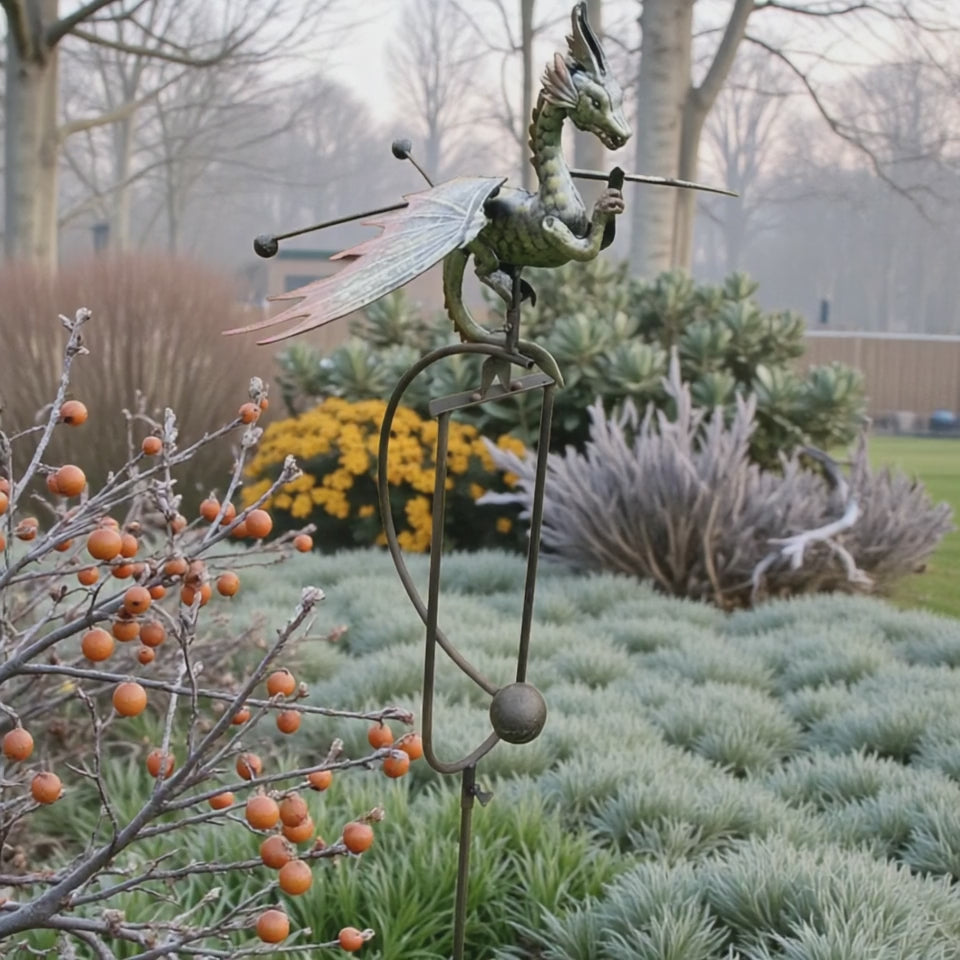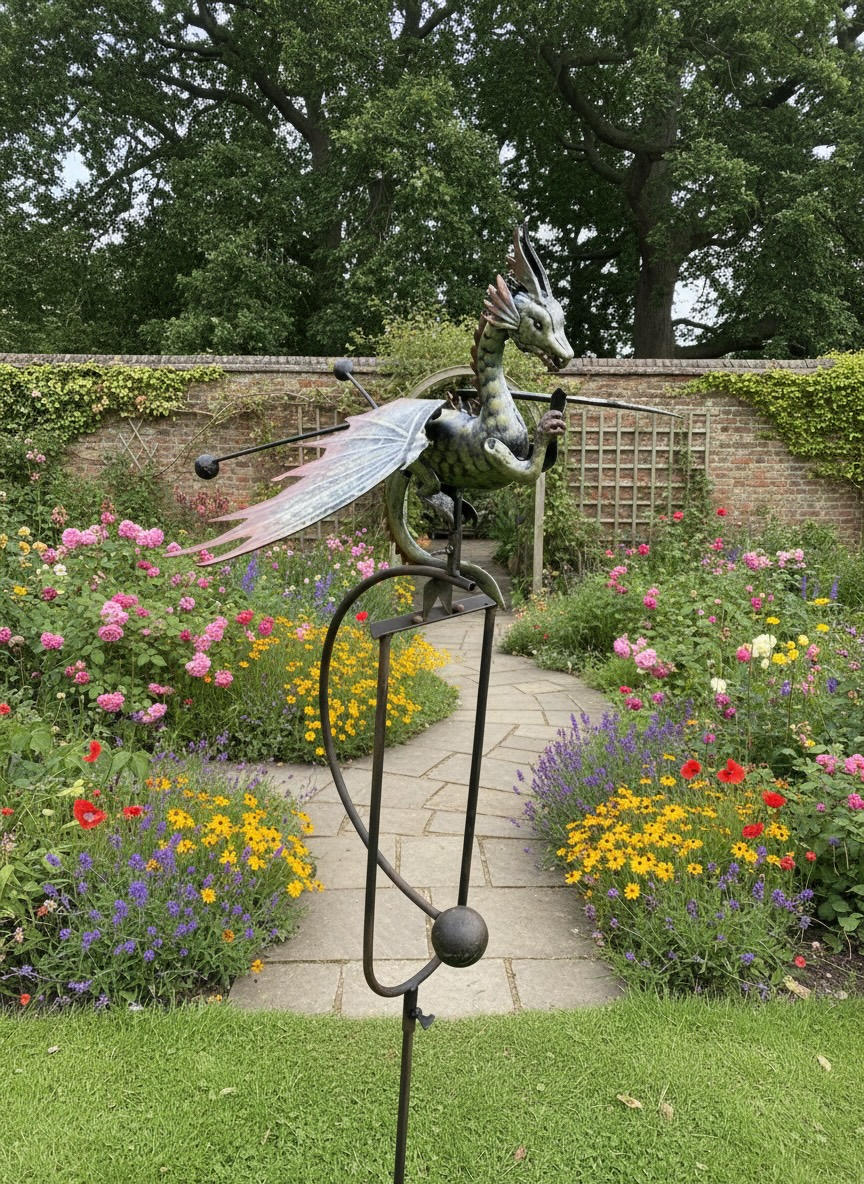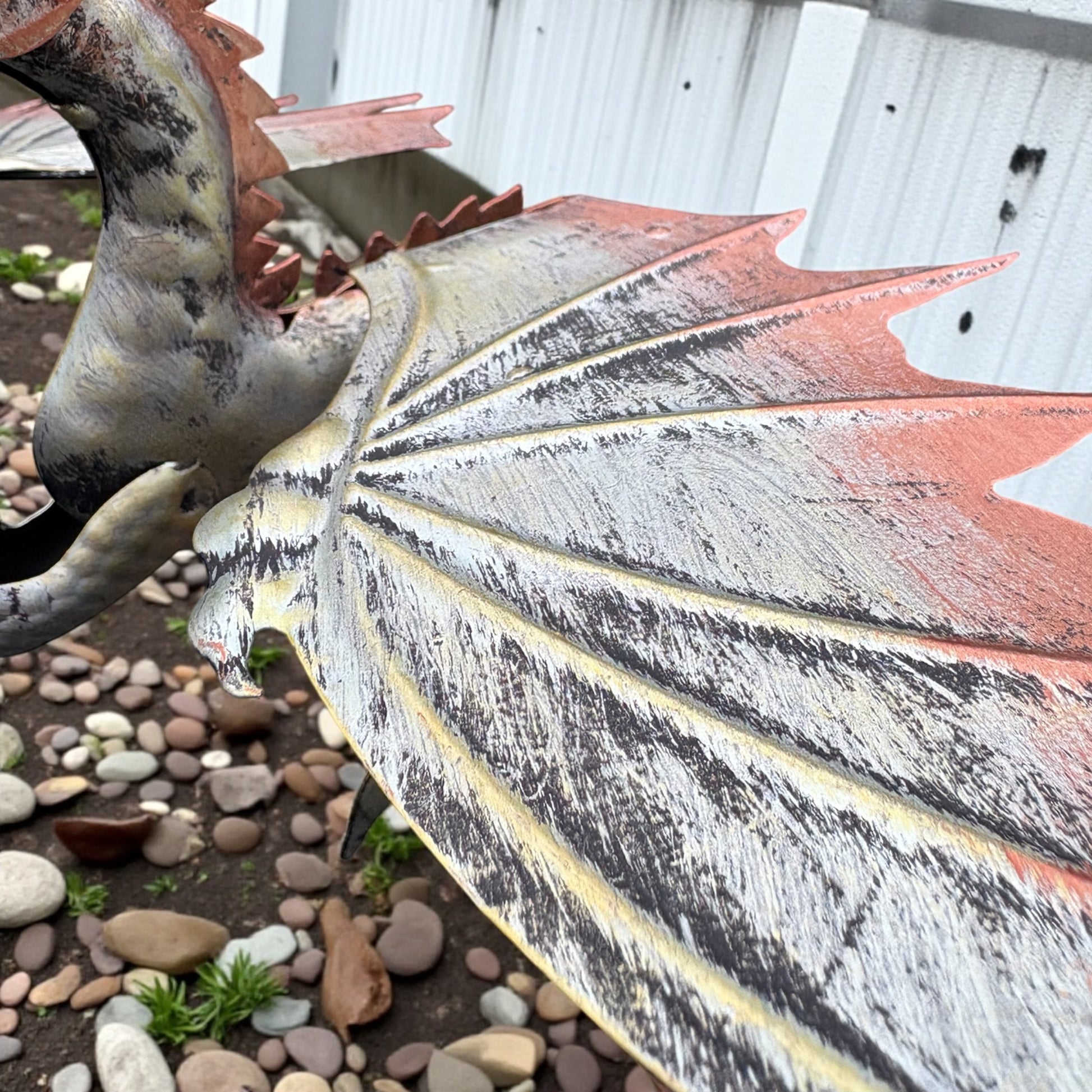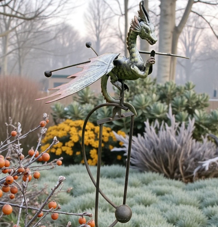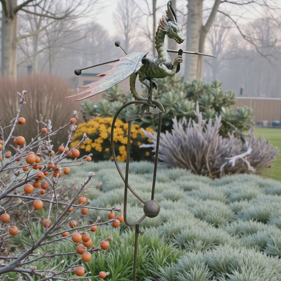 The mystery and magic of the creature unfolds as the dragon wind rocker moves its wings with the breeze, creating a focal point and unleashing whimsy into your garden.